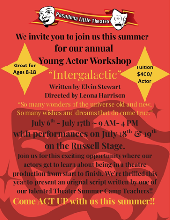 Once registered, you will get an informational email to explain everything you need to know about what the Young Actor Workshop at Pasadena Little Theatre will be like. If you have any questions or concerns at any time, you may email Leona Harrison, PLT Education Manager, at leonarose4@comcast.net or call her at 713-854-7414.